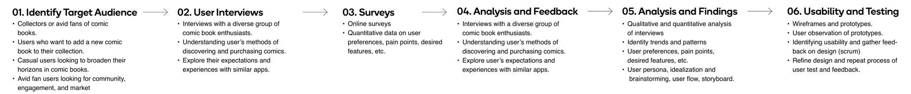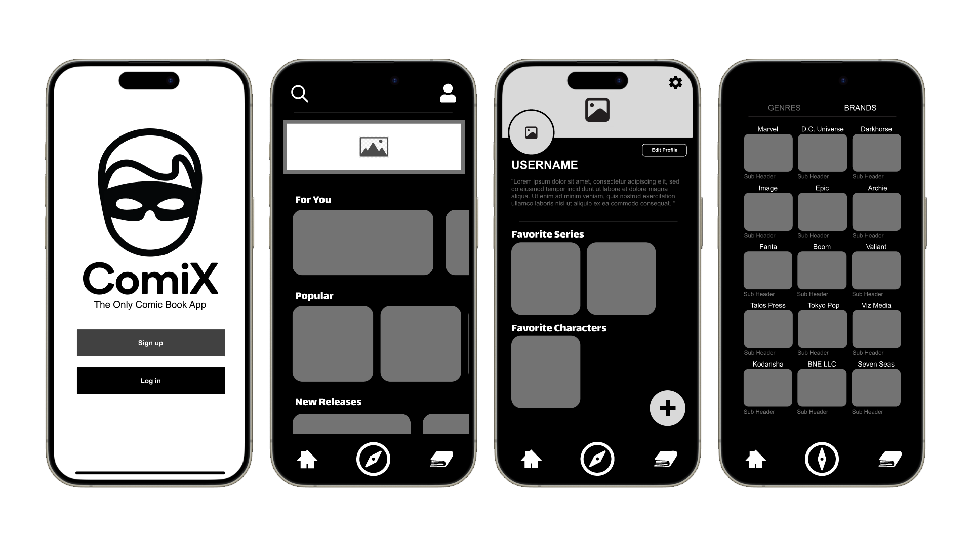 After mapping out the user journey and analyzing the gathered data, our team began designing wireframes to create an intuitive, streamlined experience tailored to our target audience. To highlight the vibrant art of the comics, we chose a grayscale wireframe with bold blue accents for CTA buttons. The only additional color is a subtle gradient on the splash screen, offering a visually striking introduction to the app.